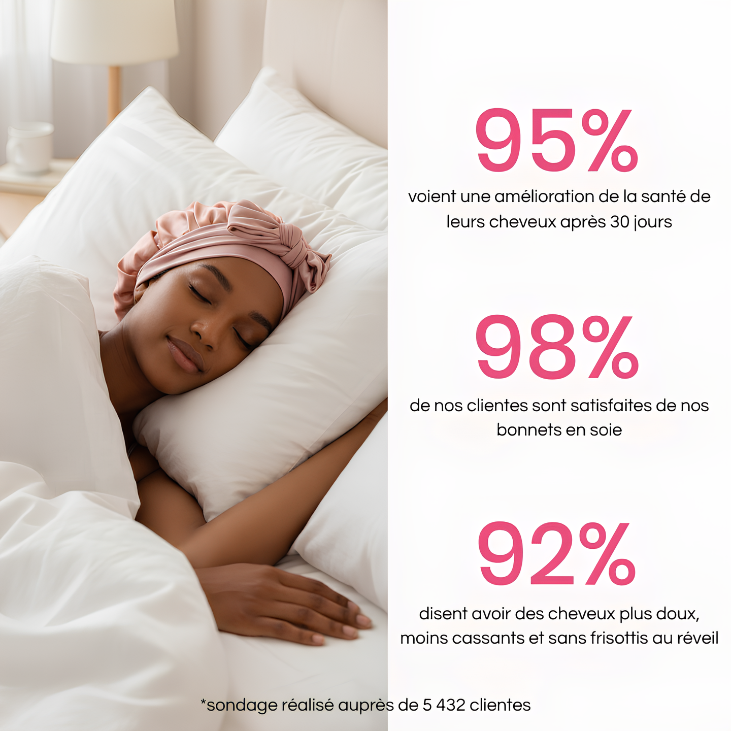Ce bonnet a changé ma routine. Je bouge énormément la nuit et il reste parfaitement en place. Mes coiffures tiennent plus longtemps, mes cheveux cassent moins et gardent leur brillance.